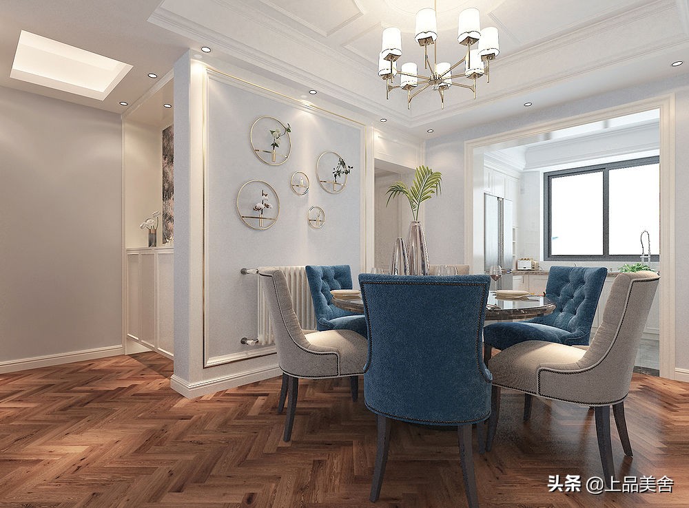 客厅采用大量的白色护墙板,凹凸的立体造型,呈现出精致优雅的高级感,蓝色的硬包背景加上皮质的沙发与大理石茶几的质感,通过这样独特的搭配手法,让空间更具优雅精致的轻奢感。